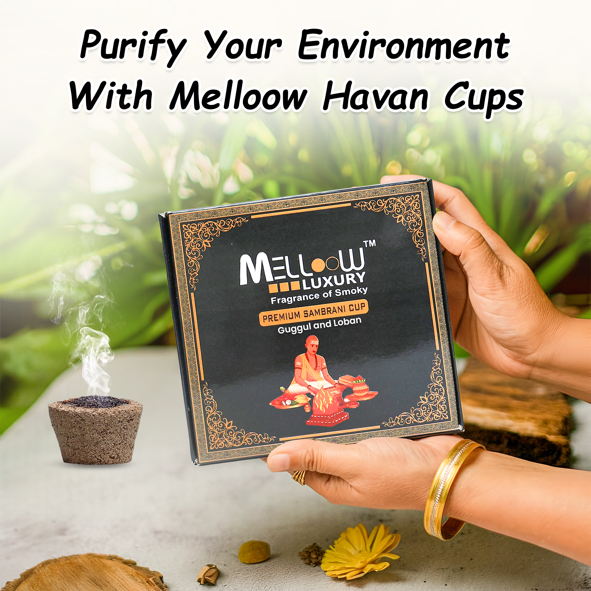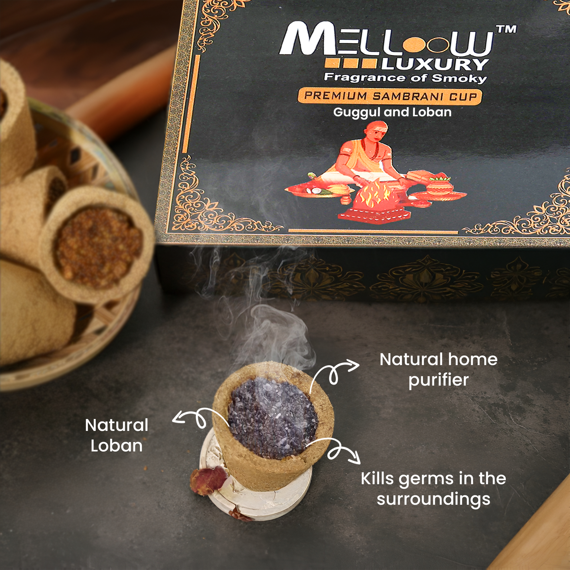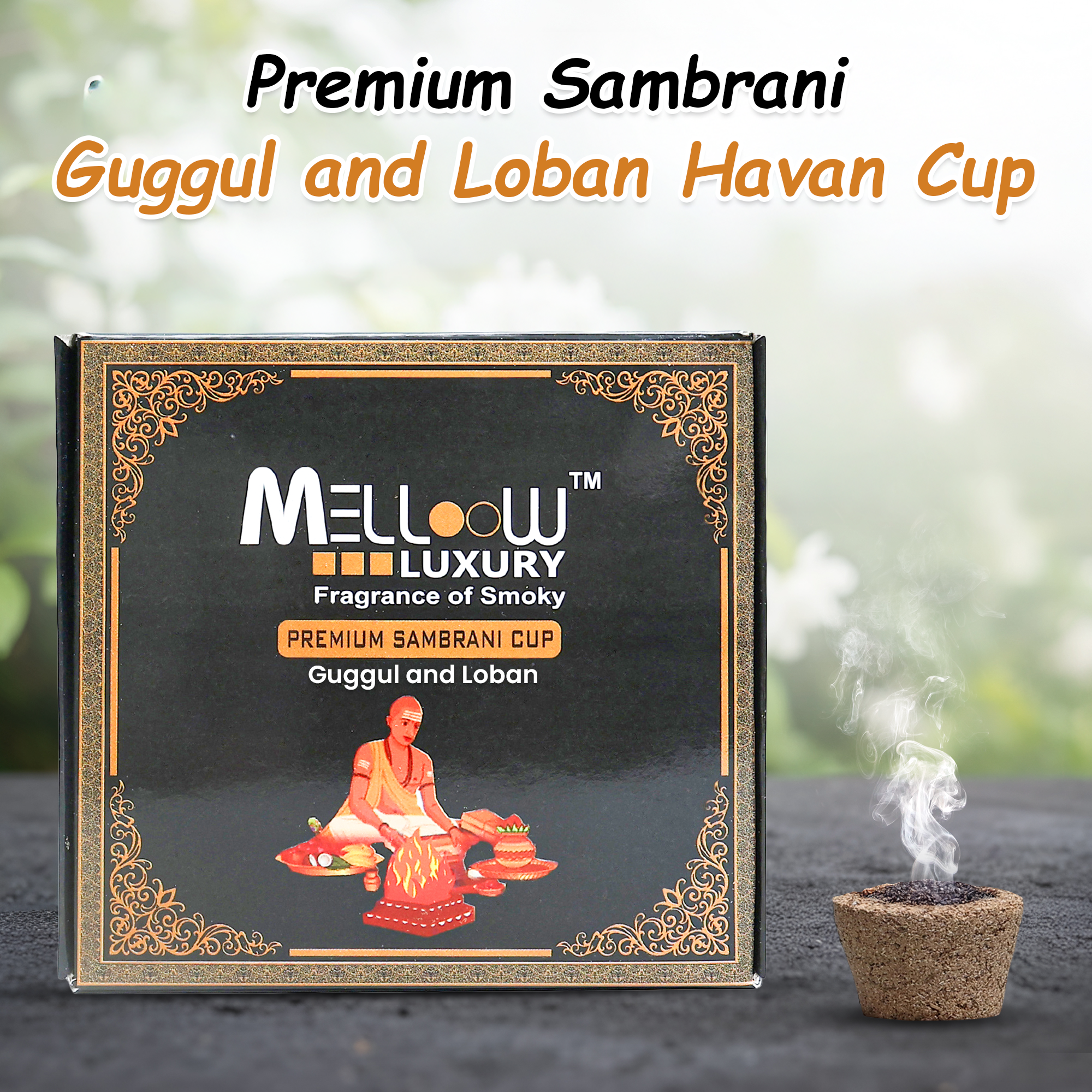 Immerse yourself in the divine blend of Guggul and Loban with Melloow Luxury Premium Sambrani Cups. Each cup is handcrafted using pure natural resins, herbs, and essential oils to deliver a rich, purifying aroma that uplifts your surroundings and calms the mind.