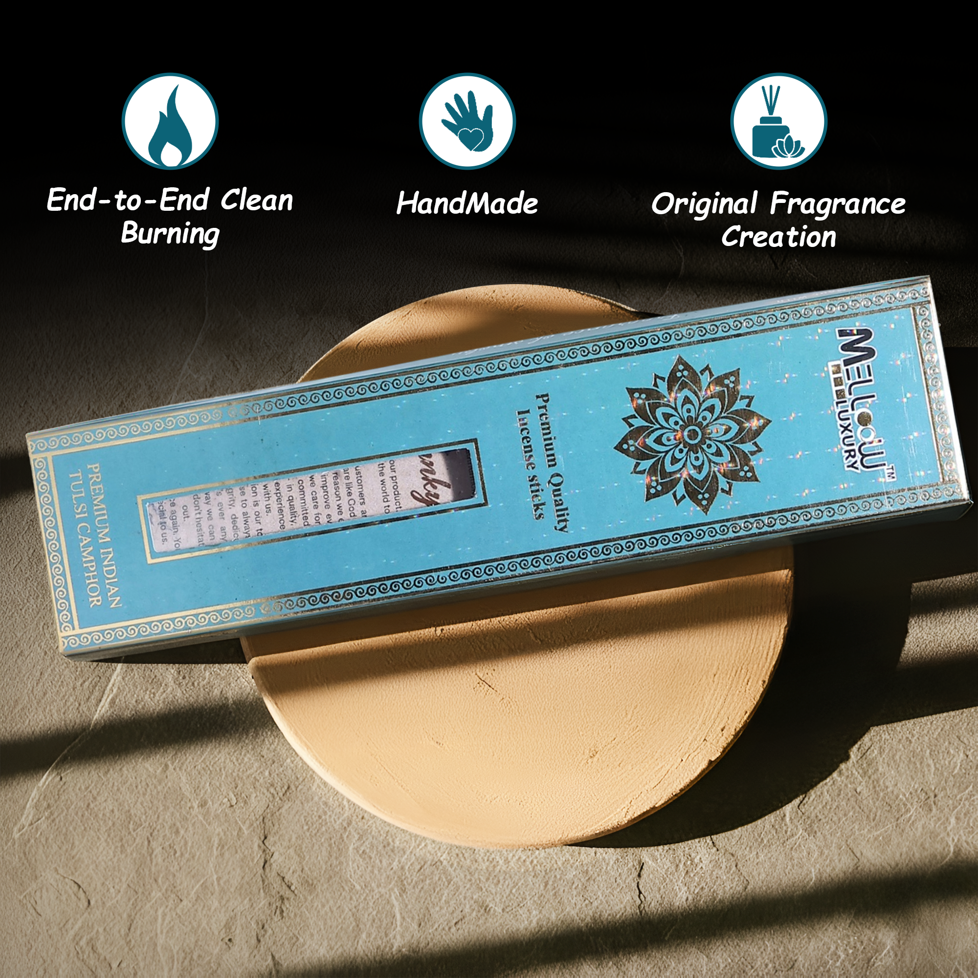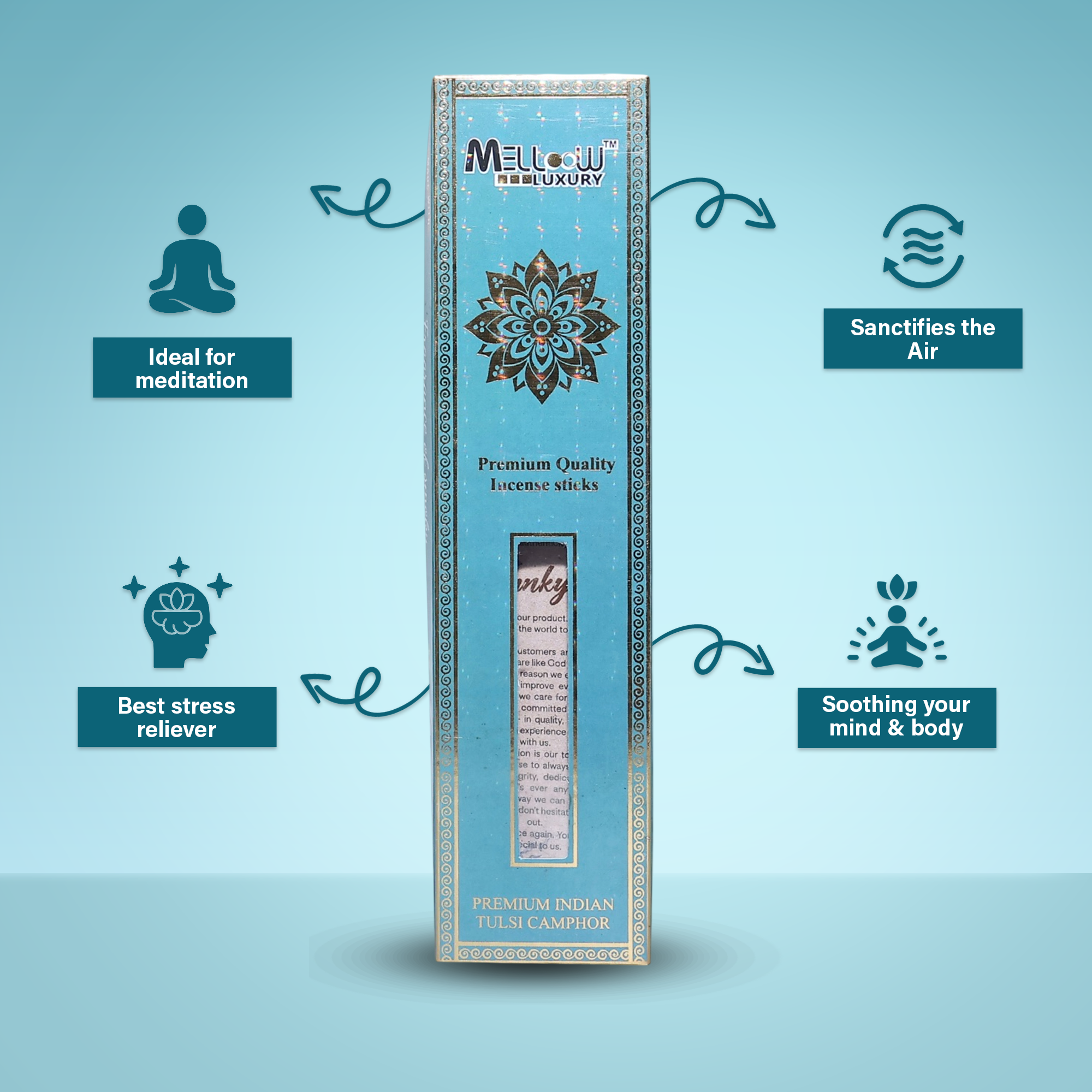 Tulsi, revered for its purifying and healing properties, combined with the cleansing aroma of camphor, helps eliminate negative energies and promotes peace and positivity in your home or sacred space. Ideal for daily worship, yoga sessions, or simply creating a serene environment, these incense sticks burn evenly and leave a long-lasting fragrance.